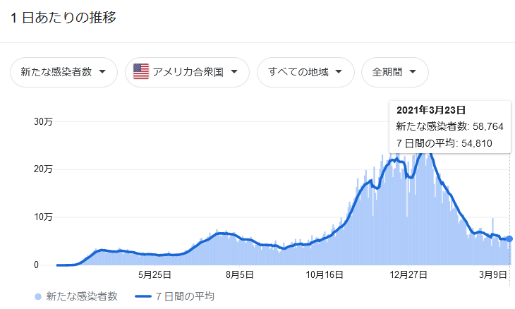 米国の新規感染者数は新型コロナワクチン接種開始から減少が続いていましたし、