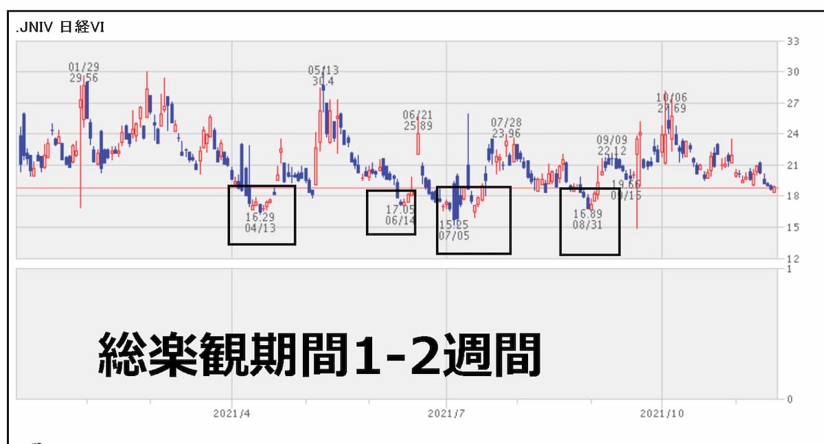 黒枠で囲っているところを見ても、1~2週間過ぎたら日経VIは上昇しています。