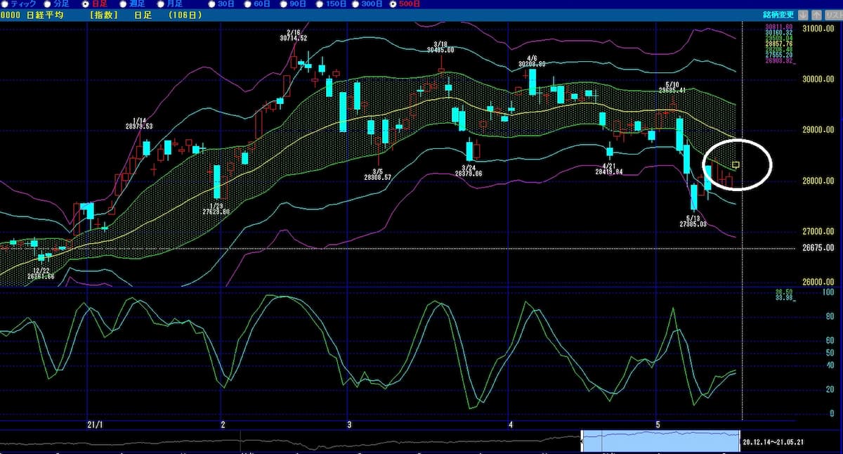 日経平均がついにボリンジャーバンドのー1σをテクニカルベースでは抜いてきました。