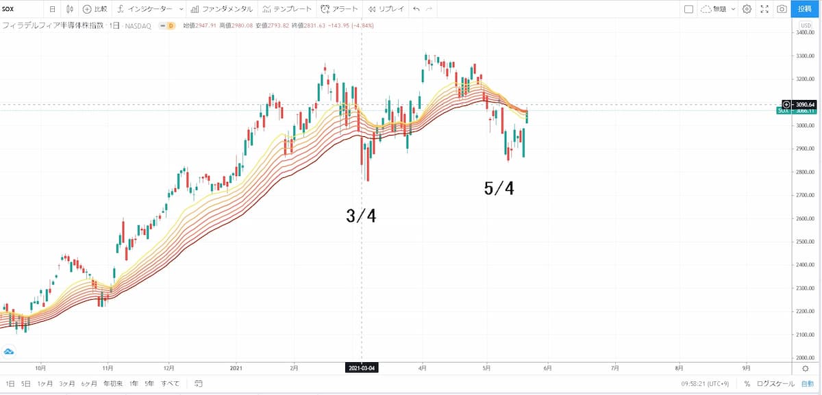 図を見るとSOX指数がリボンチャートを下抜いたのが3月4日と5月4日となります。