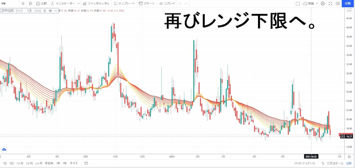 図のチャートをみるとVIX指数は再びレンジの下限までいきました。