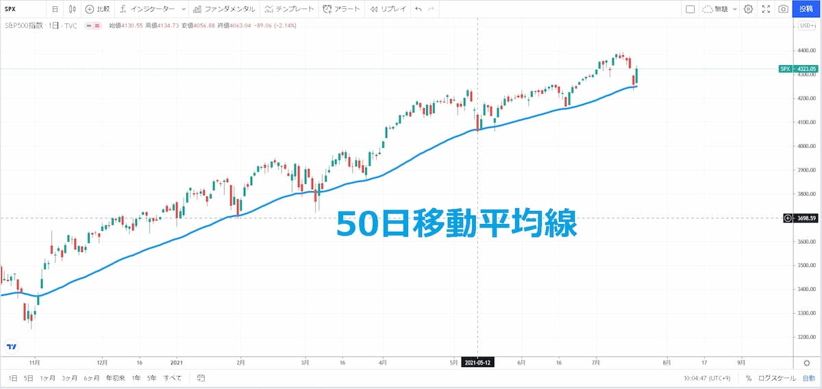 またS&P500のチャートは50日移動平均線のトレンドラインを崩していません。