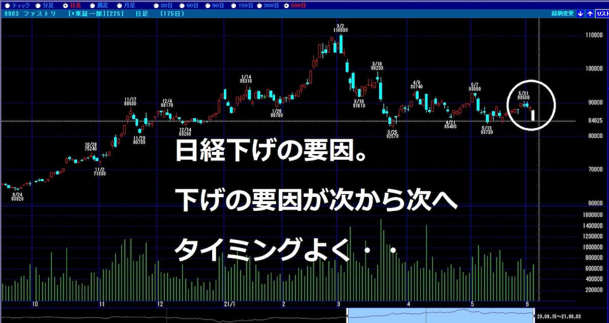 日経平均のチャートは5月10日の高値を越えられず、5月28日の高値もままならない状況です。