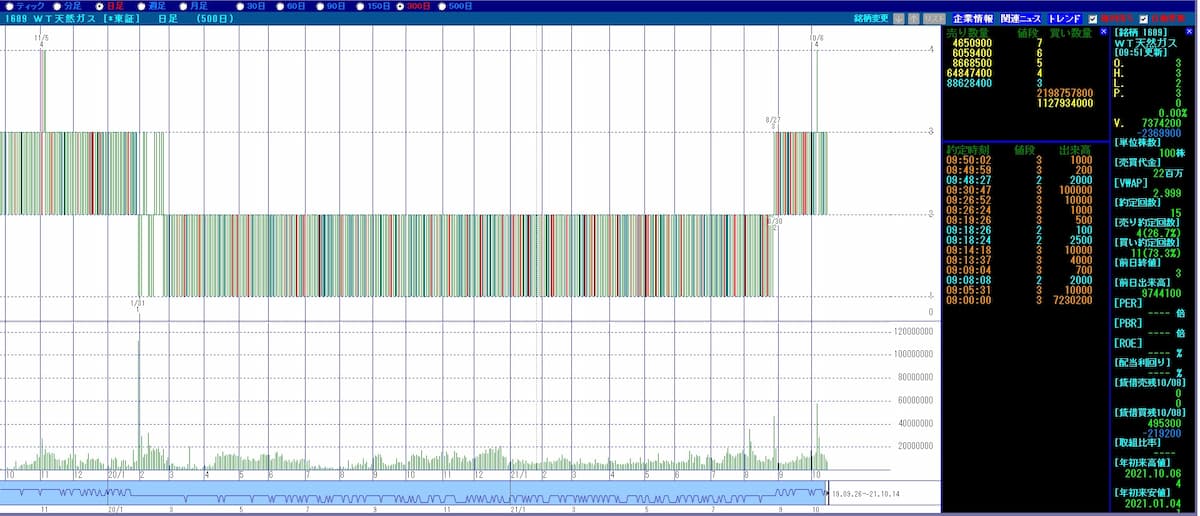 図はこのETFの日足チャートですが、まるでバーコードの様な形状になっています。
