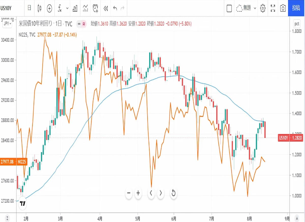 図は米国債10年利回りと日経平均株価のチャートです。