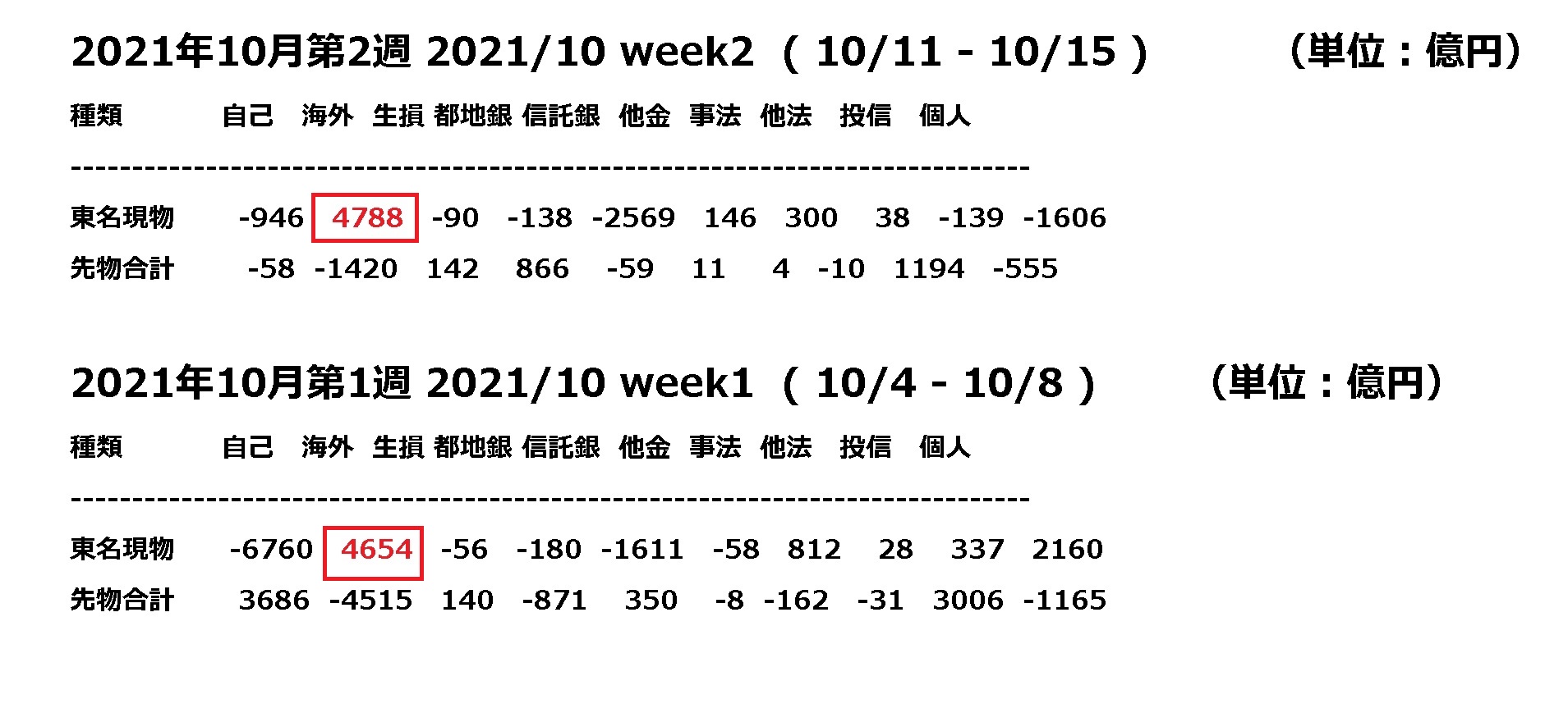 10月の第1週目と第2週目を見ると、先物は1週目は約4500億円の売り、