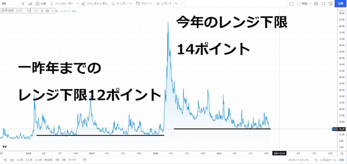 コロナショック時はVIX指数は80ポイント台まで上昇していましたが、