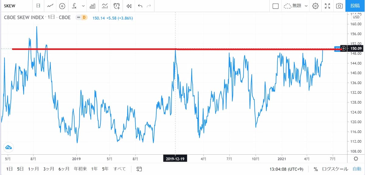 図をみると、スキュー指数が今年1番の高値を超えているのが分かります。