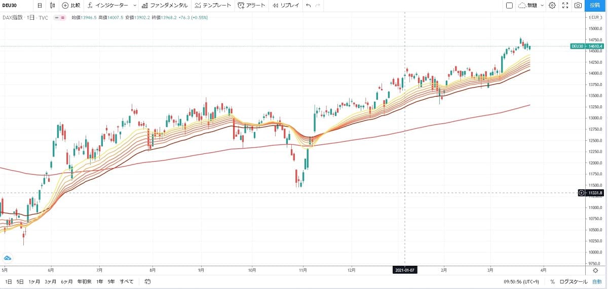 ドイツの株価指数であるDAX指数の様子をみると陽線ばかりで陰線がありません。
