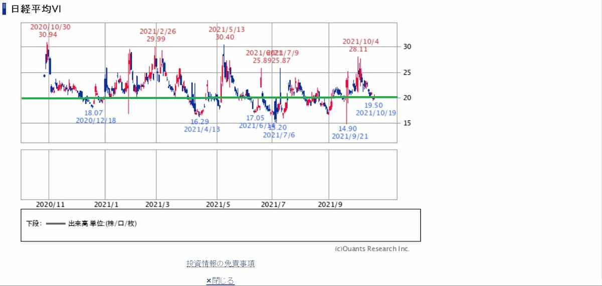 ここ数ヶ月は日経平均VIが20ポイント割り込むと、相場の天井となっています。