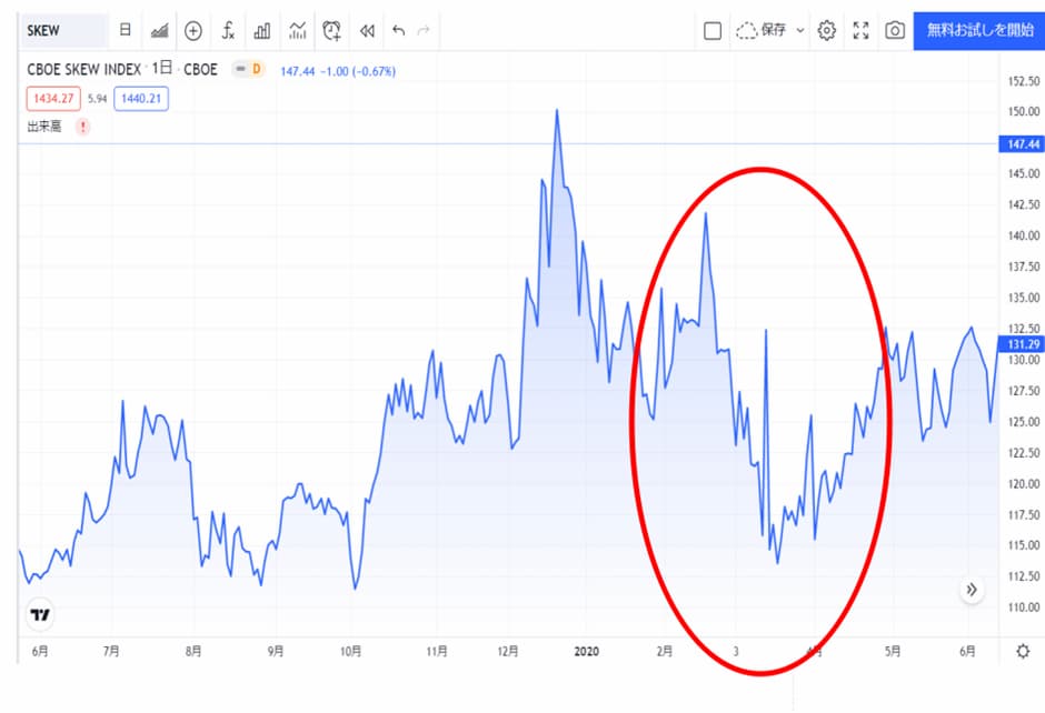 コロナショックのときのSKEW指数