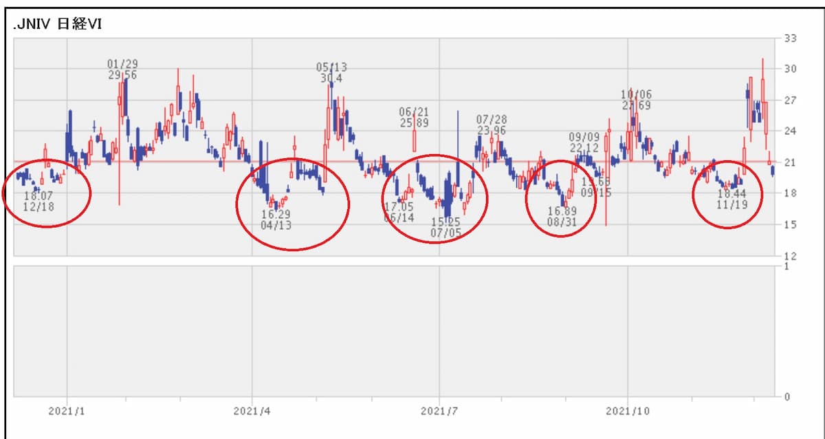 赤丸部分は日経VIが20ポイント割り込んだ時、
