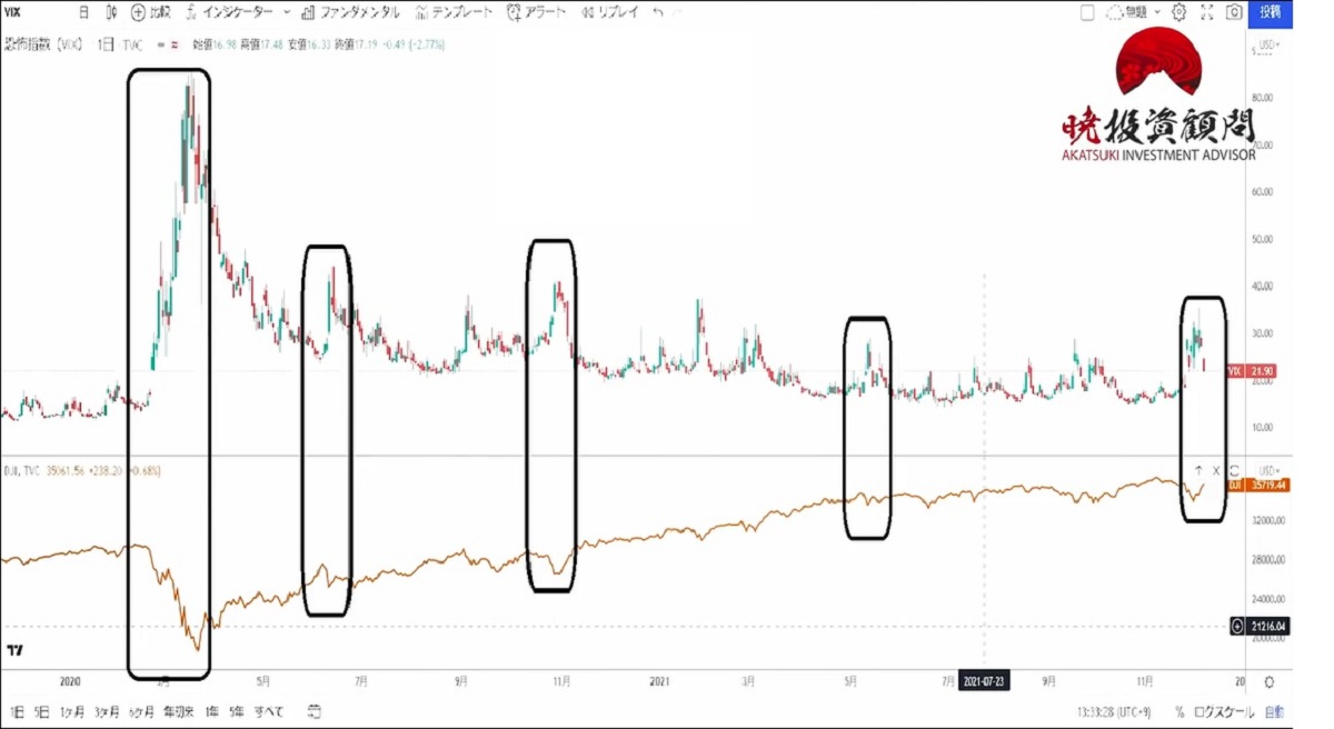 NYダウが下落に転じるとVIX指数が跳ね上がる傾向があります。