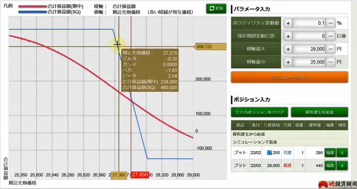 図は27,000円のプット売り2枚と28,000円のプット買い1枚の損益チャートです。