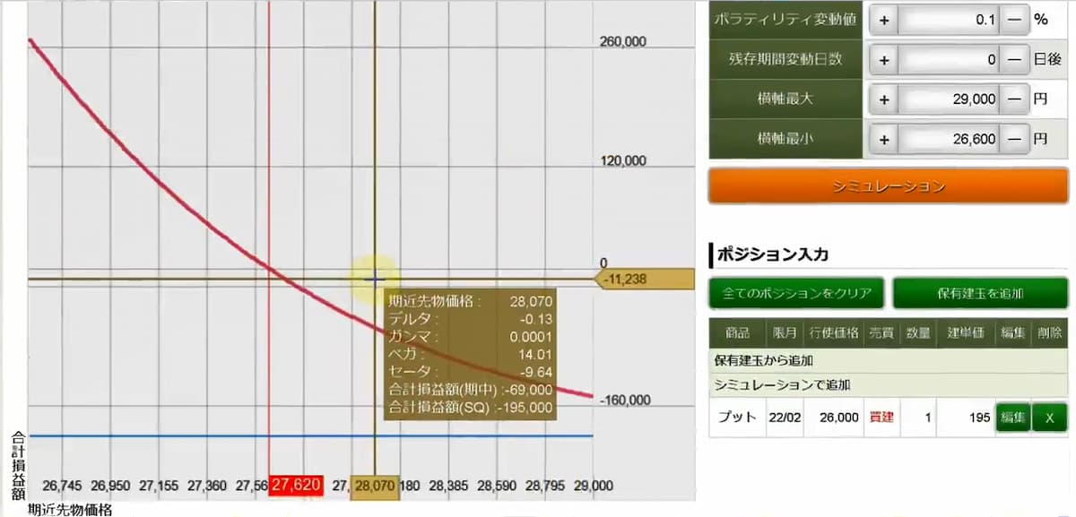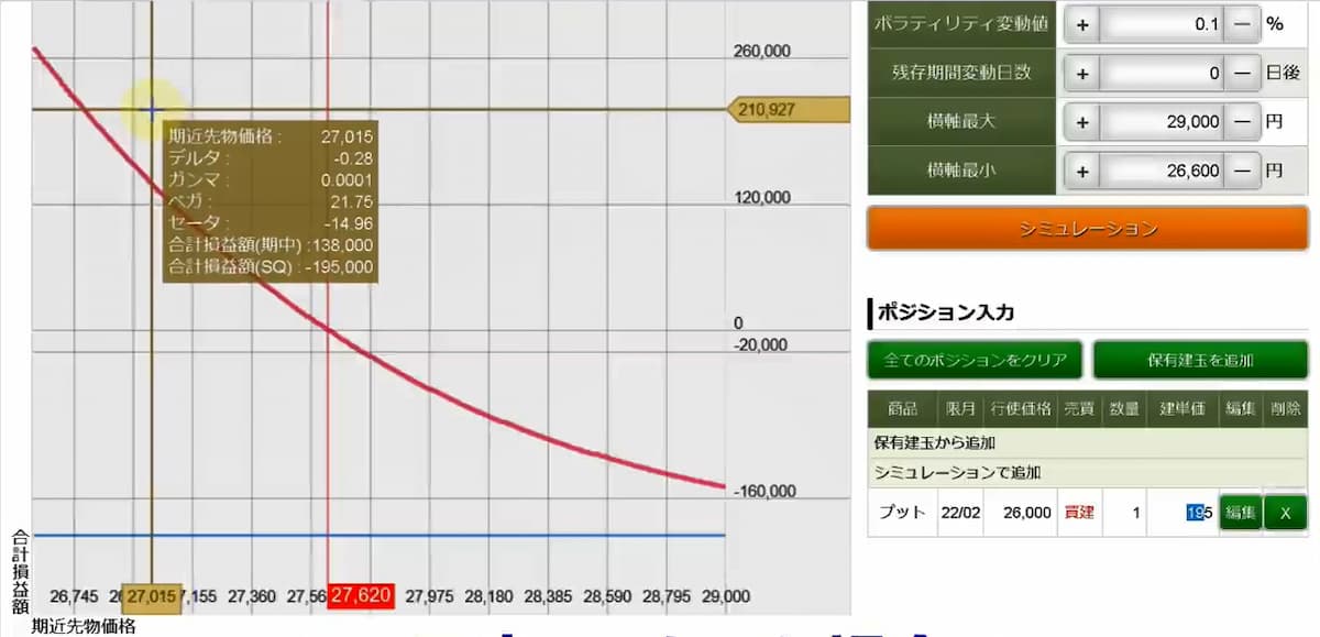 26,000円のオプションのプット買い1枚の損益シュミレーターです。