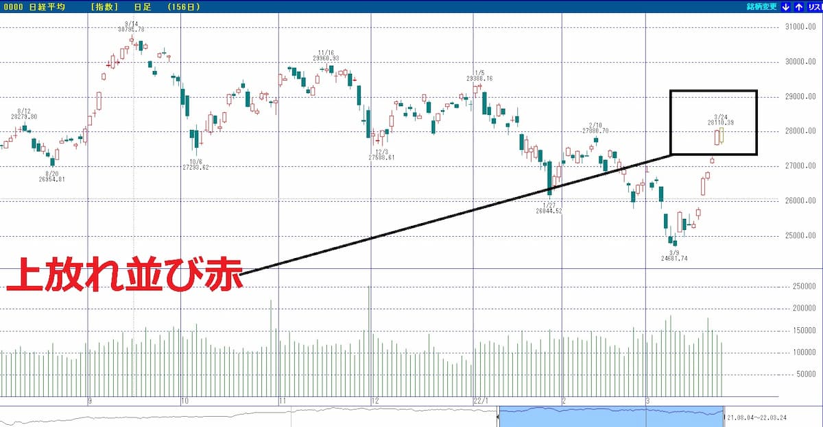 図の日経平均株価のチャートを見ると上放れ並び赤が出現しています。