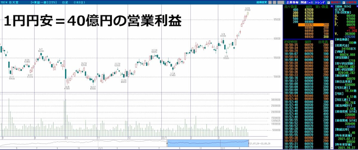 実は7974 任天堂は隠れた円安恩恵銘柄です。なんと1円円安で40億円の営業利益が発生します。