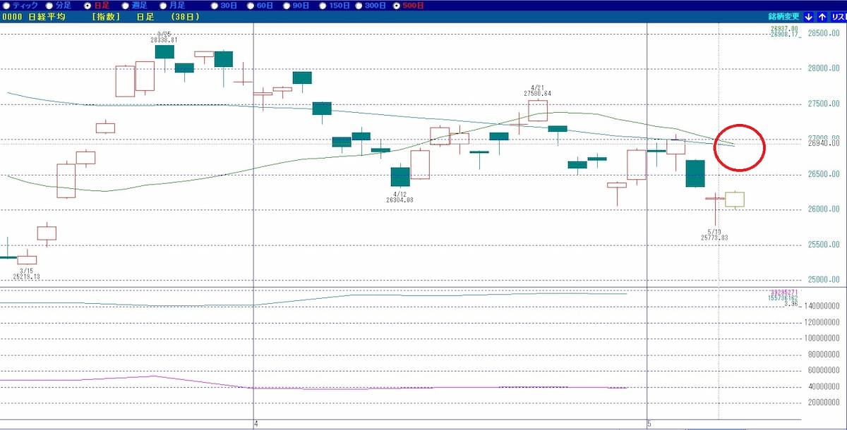日経平均株価の25日移動平均線と75日移動平均線がデッドクロスしようとしています。