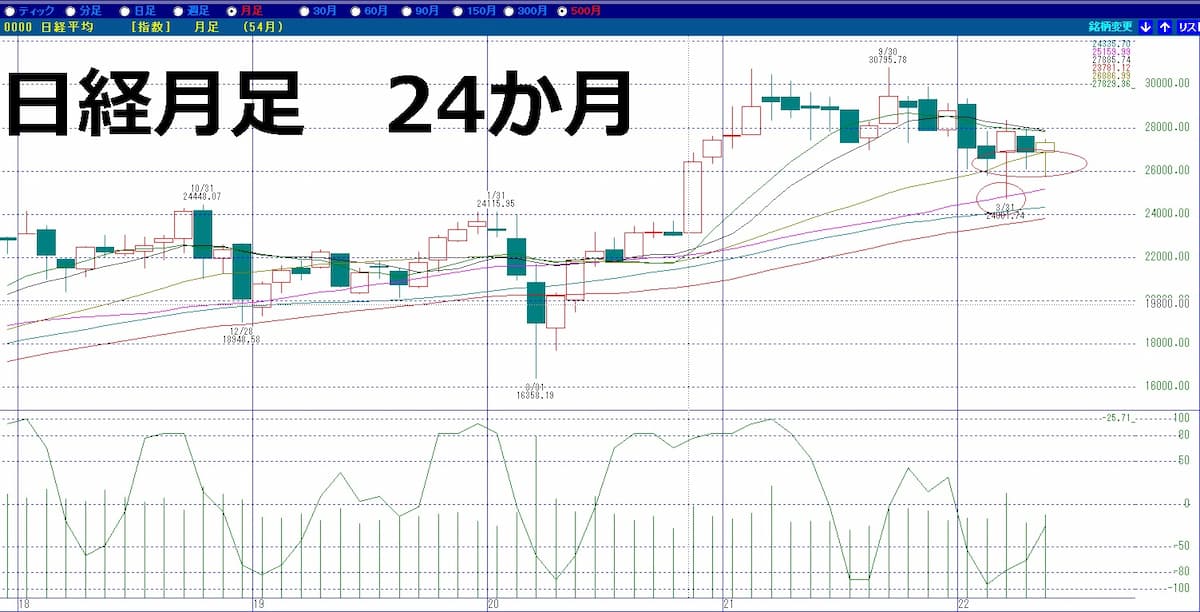 月足の24か月移動平均線がサポートになっていることが分かります。