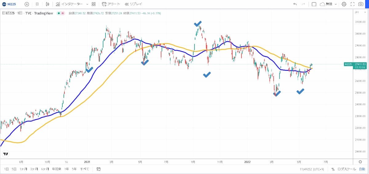 図は日経平均株価のチャートで、チェック印のところはSQ日を表しています。
