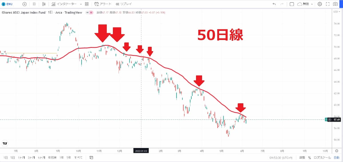 図はiシェアーズMSCIジャパンETF(EWJ)のチャートです。