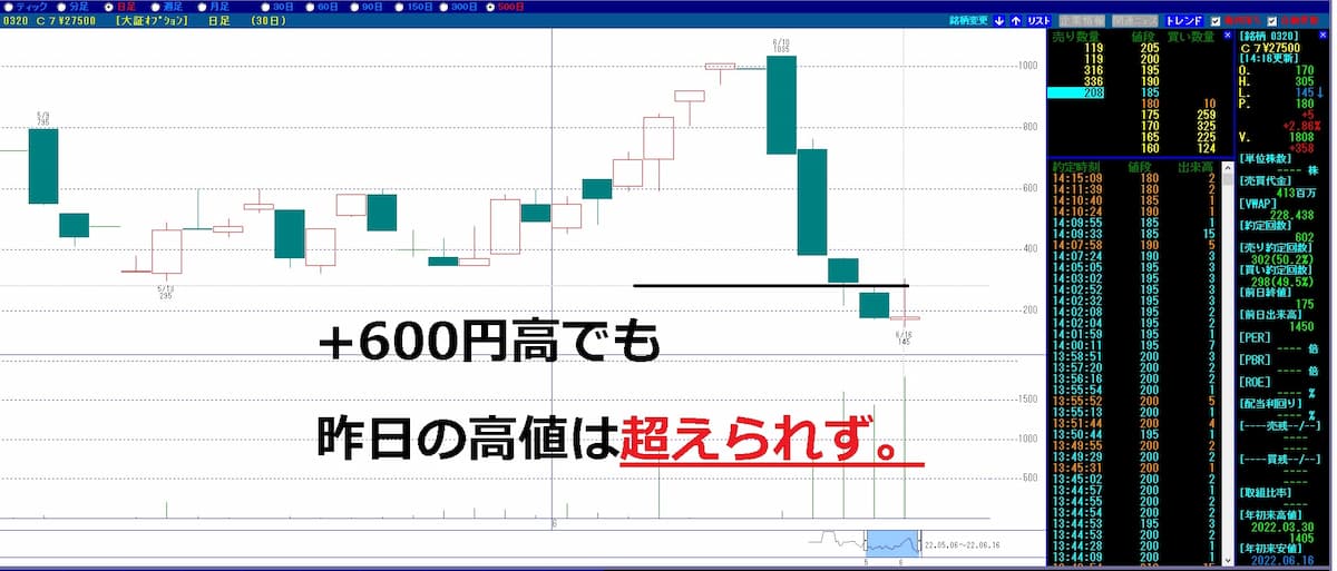 図はコールオプション7月限27,500円の日足チャートで、