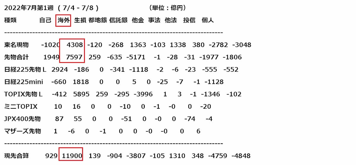 図は14日に発表された7月第1週の投資主体別売買動向のです。
