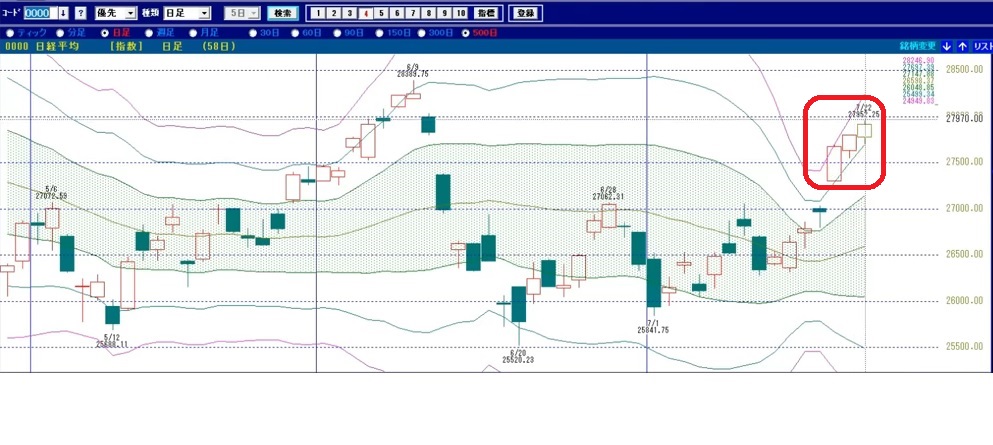 日経平均株価はボリンジャーバンドの+3σと+2σの間を抜けていく急騰、