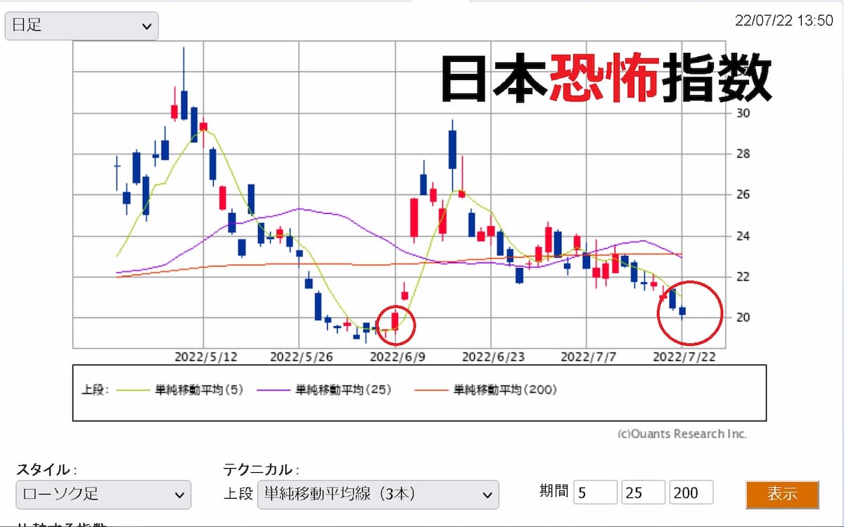 5日移動平均線にぶら下がっている状況なので、このまま日経平均VIがなだらかになって、