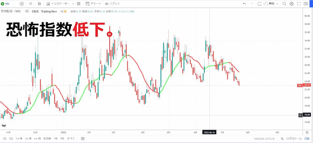 図は恐怖指数であるVIX指数のチャートで現在低下しています。