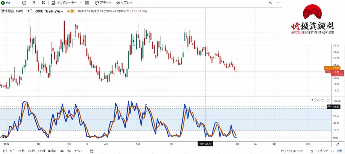 図は恐怖指数であるVIX指数の日足チャートで、VIX指数は21.33まで下がっています。