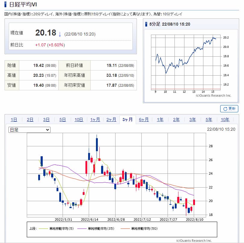 実際ボラティリティは6月の底をついて5日移動平均線にも乗っている状況なので、