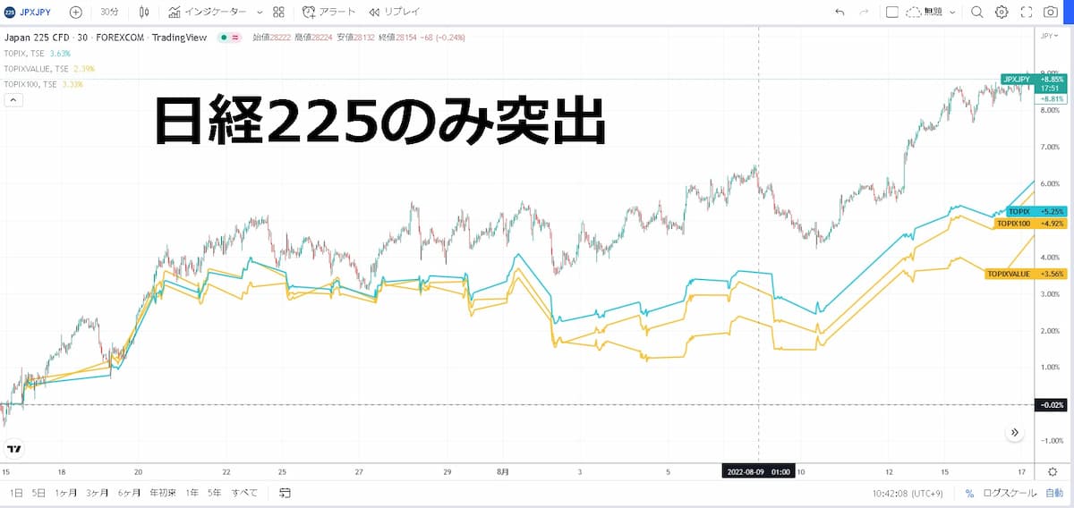 日経225CFDは+8.8%に対して、TOPIXは+5.2%、TOPIX100は4.9%、