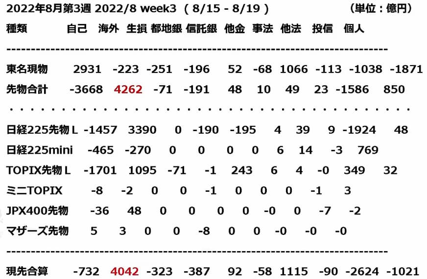 日経225先物を8月15日~8月19日の週に大きく買い越ししていました。