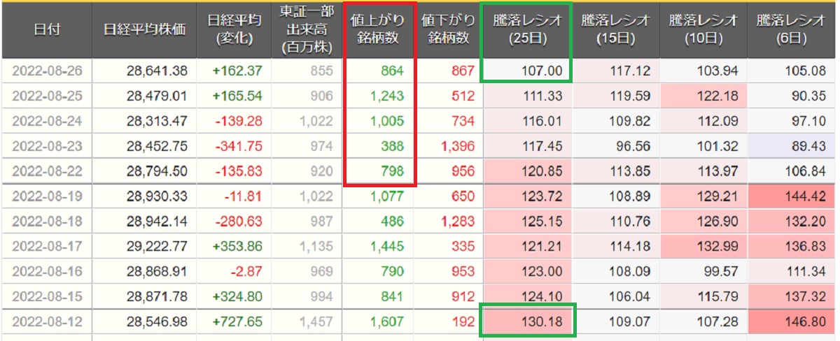 そして8月12日に騰落レシオが130%とあまりに買われすぎな状態となっていましたが、