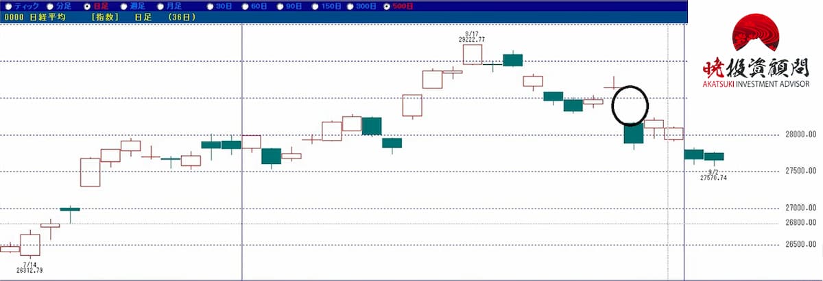 日経平均株価の日足チャートを見ると、非常に大きな窓を開けていることが分かります。