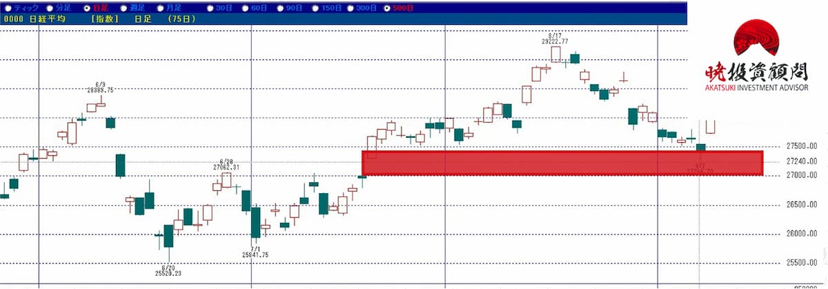 図の日経平均株価の日足チャートを見ると27,000円~27,200円辺り、