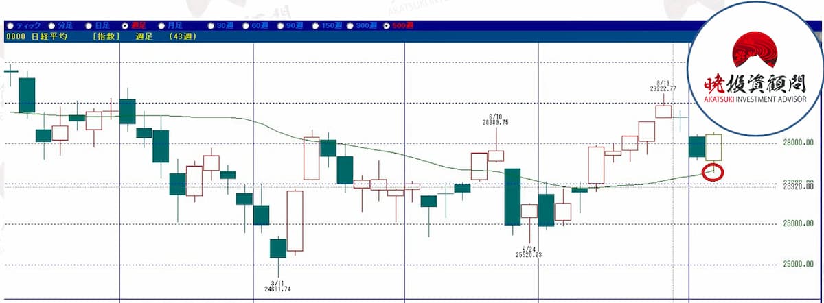 そして日経平均株価を週足チャートで見ると26週移動平均線にサポートされています。