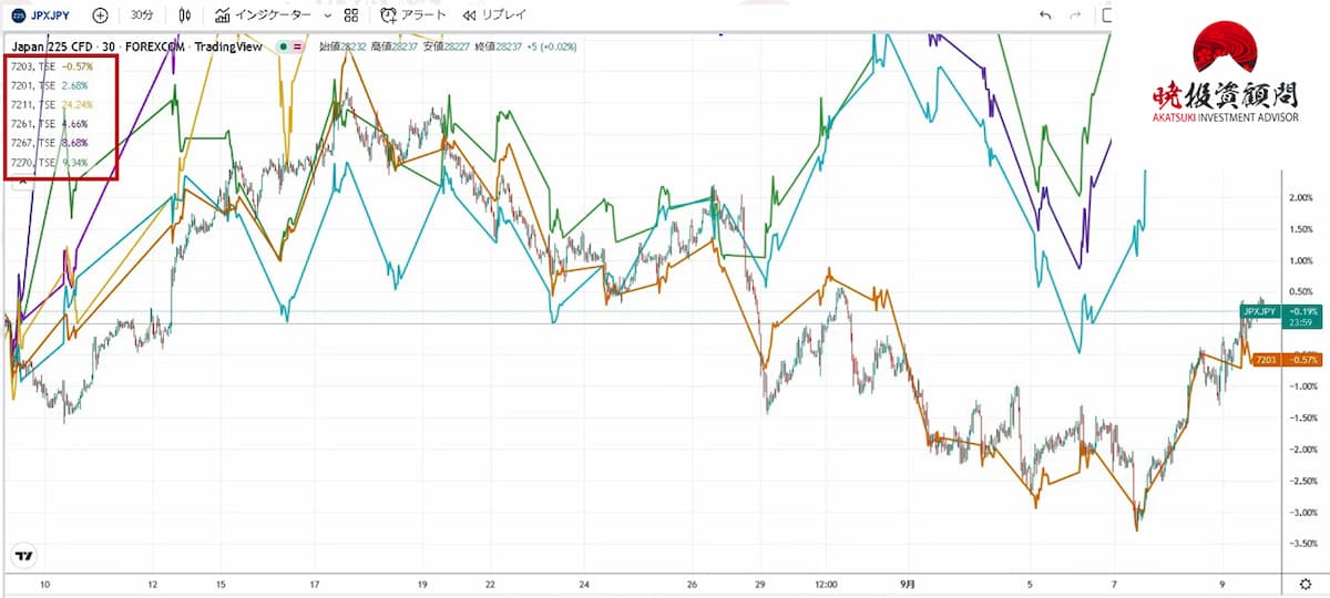 図は日経平均CFDと各社自動車株のパフォーマンスを示すチャートですが、