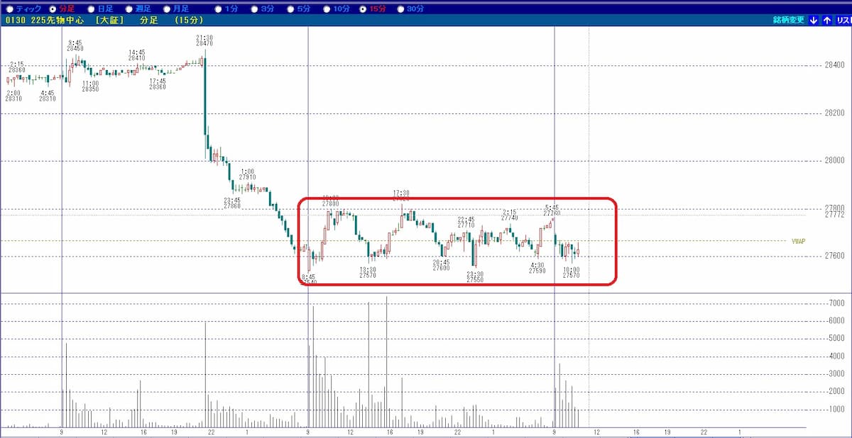 図は日経225先物の15分足チャートですが、揉み合い状態が続いているのが分かります。
