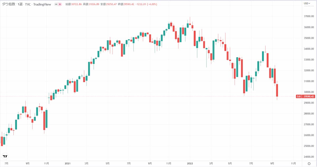 米国市場ではNYダウ指数が6月につけた年初来安値を更新し、3万ドル割れとなりました。