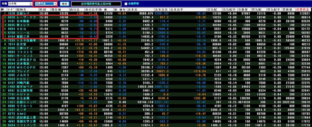 6920 レーザーテック、9101 日本郵船、8035 東京エレクトロン、9984 ソフトバンクグループ、
