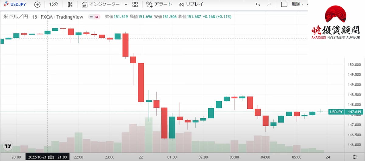 そこからドル円がガクっと下がり、ドル円は147円台と円高となりました。
