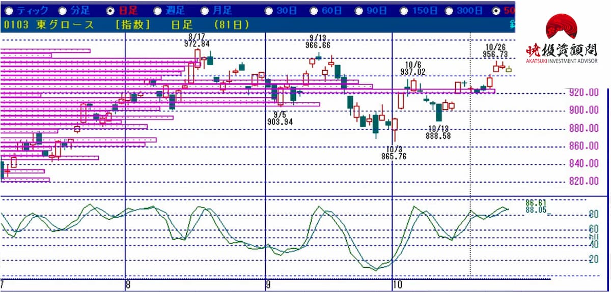 既に底を打った印象があり、855~900ポイントの売買の層が薄いので、