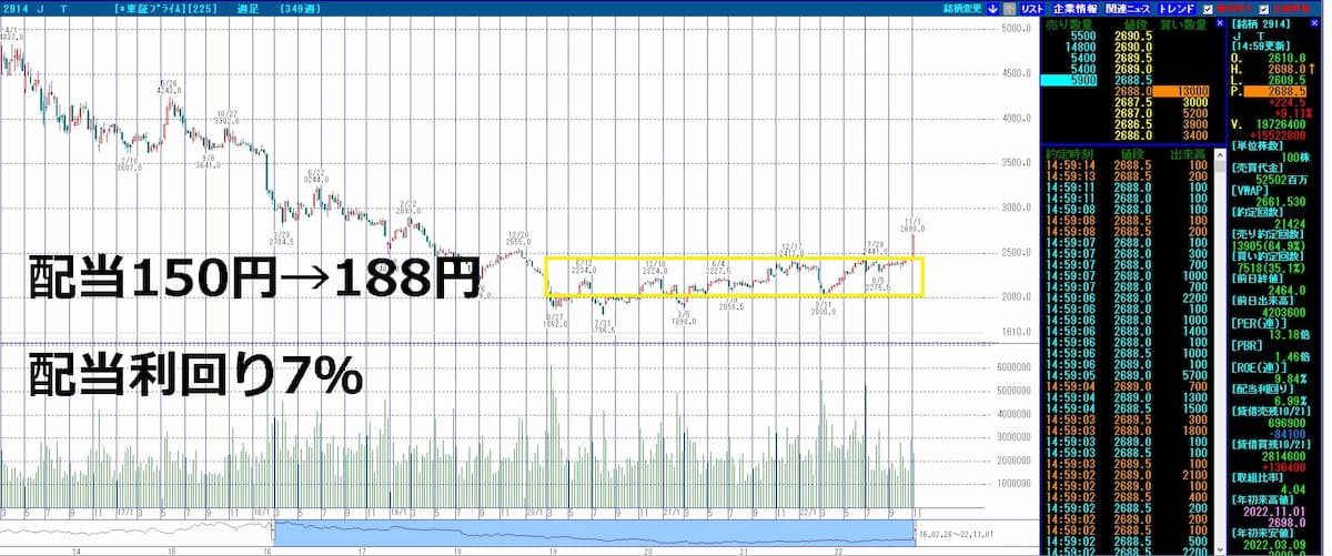 年間配当予想が150円から188円に増額されて、配当利回りが約7%となりました。
