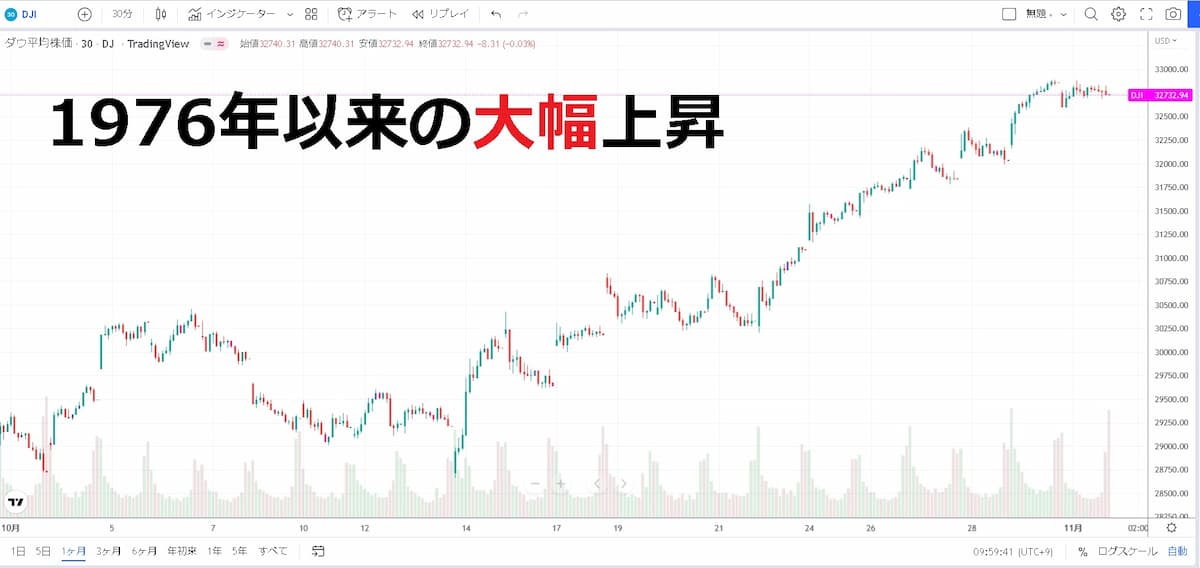 10月のNYダウは大幅上昇となり、上げ幅は約12%と1976年以来のものとなりました。