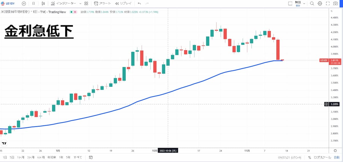 これにより市場はインフレがピークアウトしたと解釈し、金利が急低下となりました。
