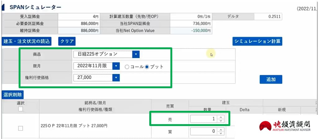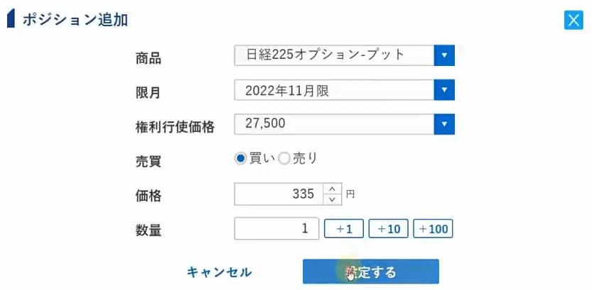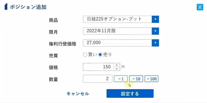 今回は例として「11月限の27000円のプットオプションを1枚売る取引」で入力します。