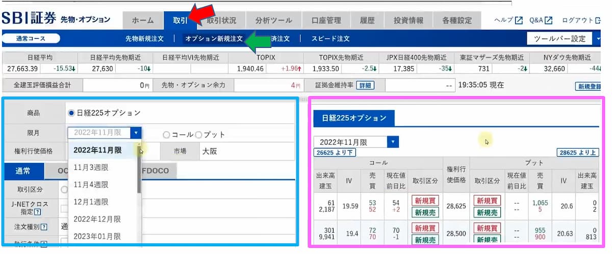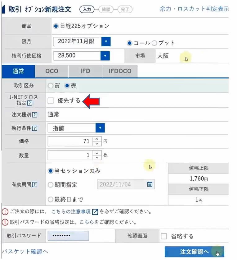 ※オプション取引は水色枠からでもピンク枠からでも注文出来ますが、今回は水色枠でのやり方で進めます。