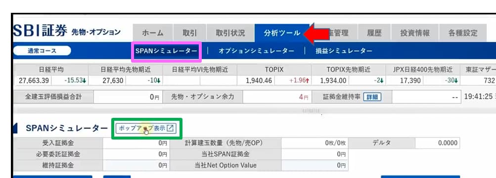 まず下図の赤矢印の「分析ツール」を押して、ピンク枠の「SPANシミュレーター」を選択します。